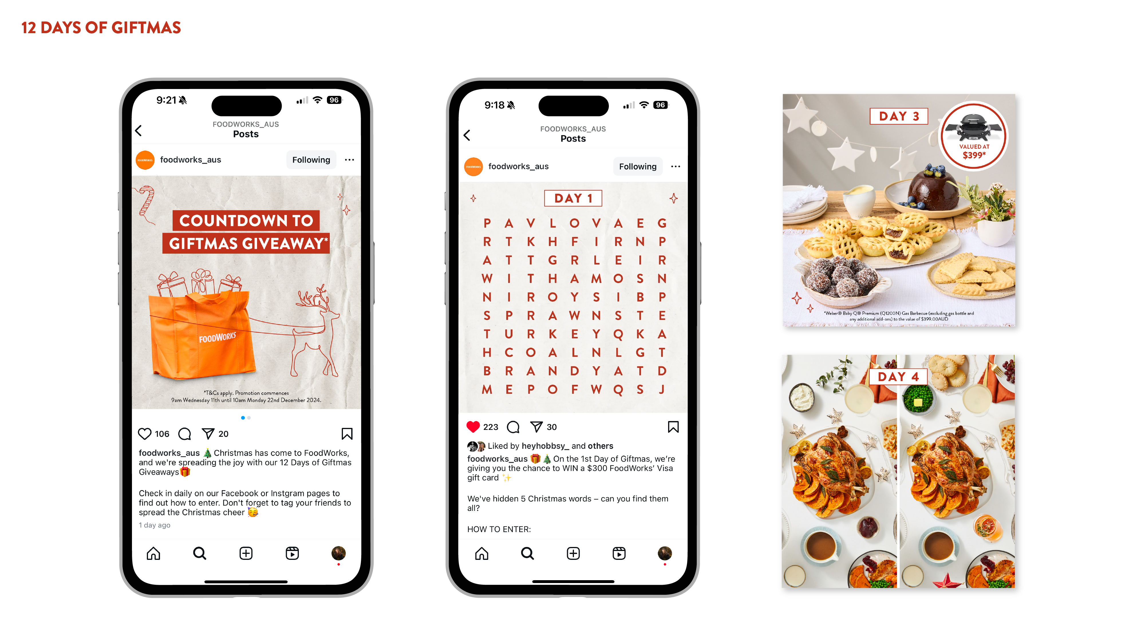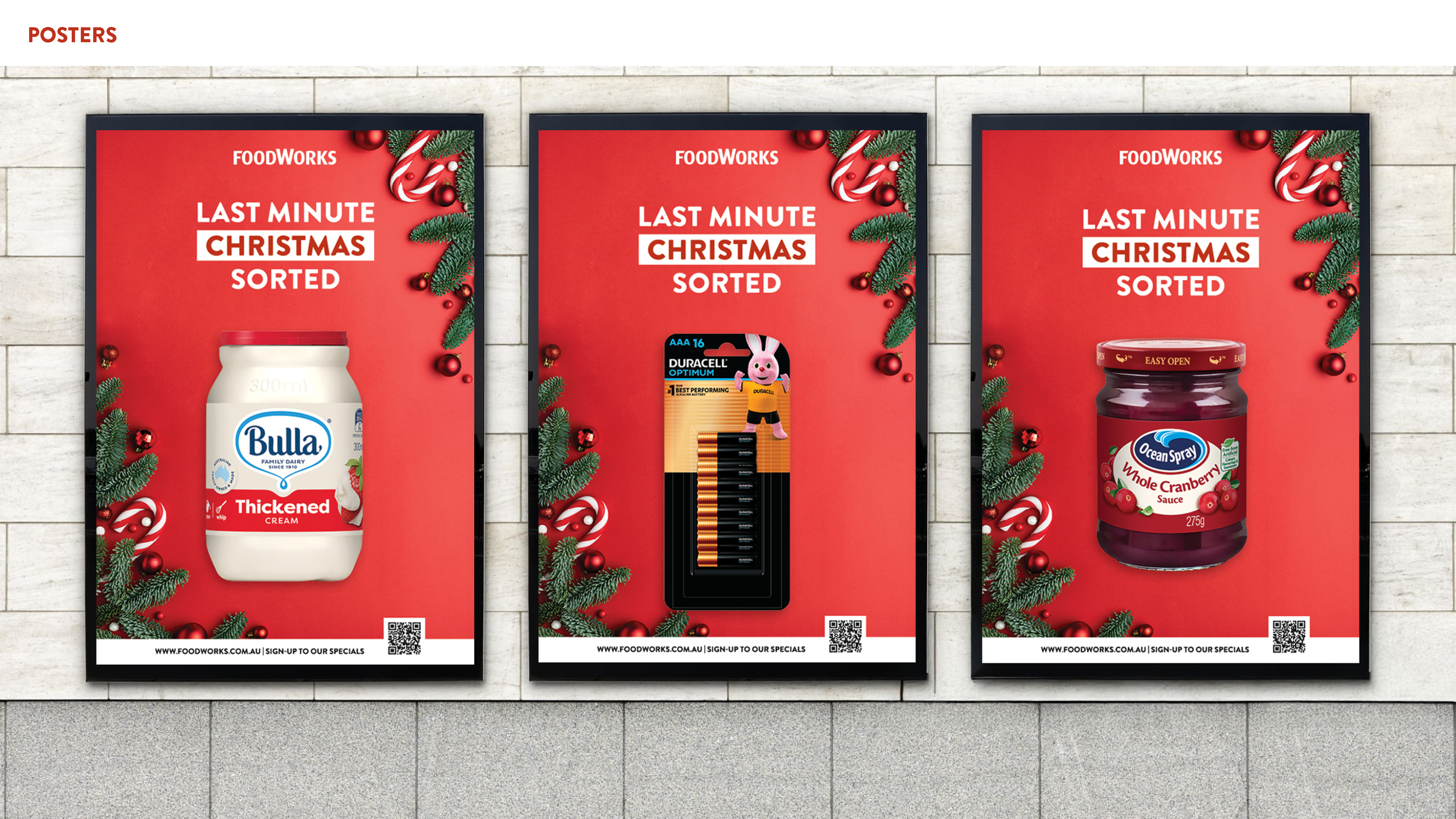 I designed all print (posters, end sign, tickets and wobblers) and digital assets (social media, website and ecom assets) for the FoodWorks Christmas campaign. The in-store assets remind customers of last minute essential items they will need for Christmas like cream, gravy and batteries.
